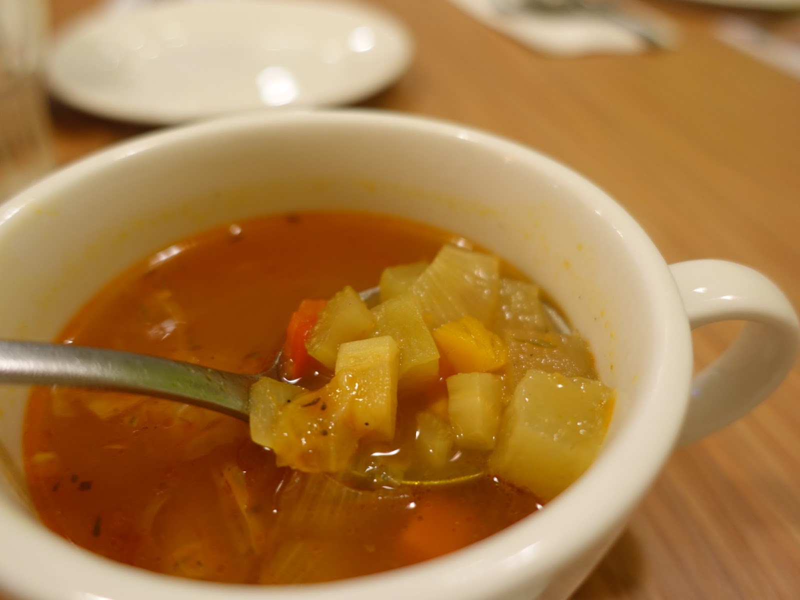 番茄羅宋湯熱騰騰上桌,碗裡有豐富的蔬菜丁與奧勒岡葉的香氣撲鼻,新鮮番茄熬煮的湯頭,喝起來非常溫暖開胃。