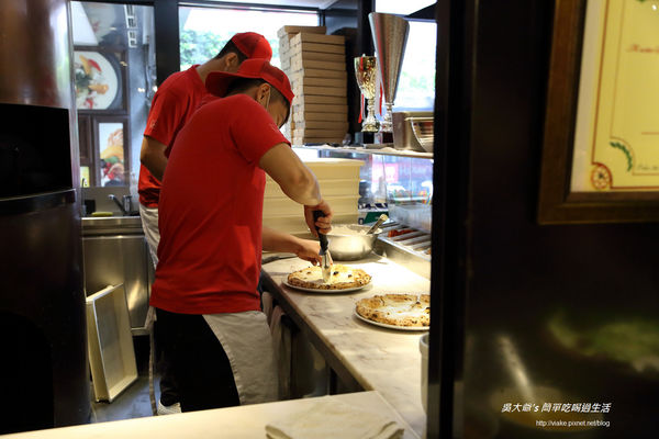 ↑取餐區的中間,可以看到師傅們正在切剛烤好的披薩