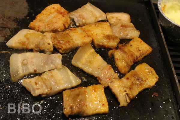 烤成金黃色後店員會把肉移至烤盤比較不熱的一端