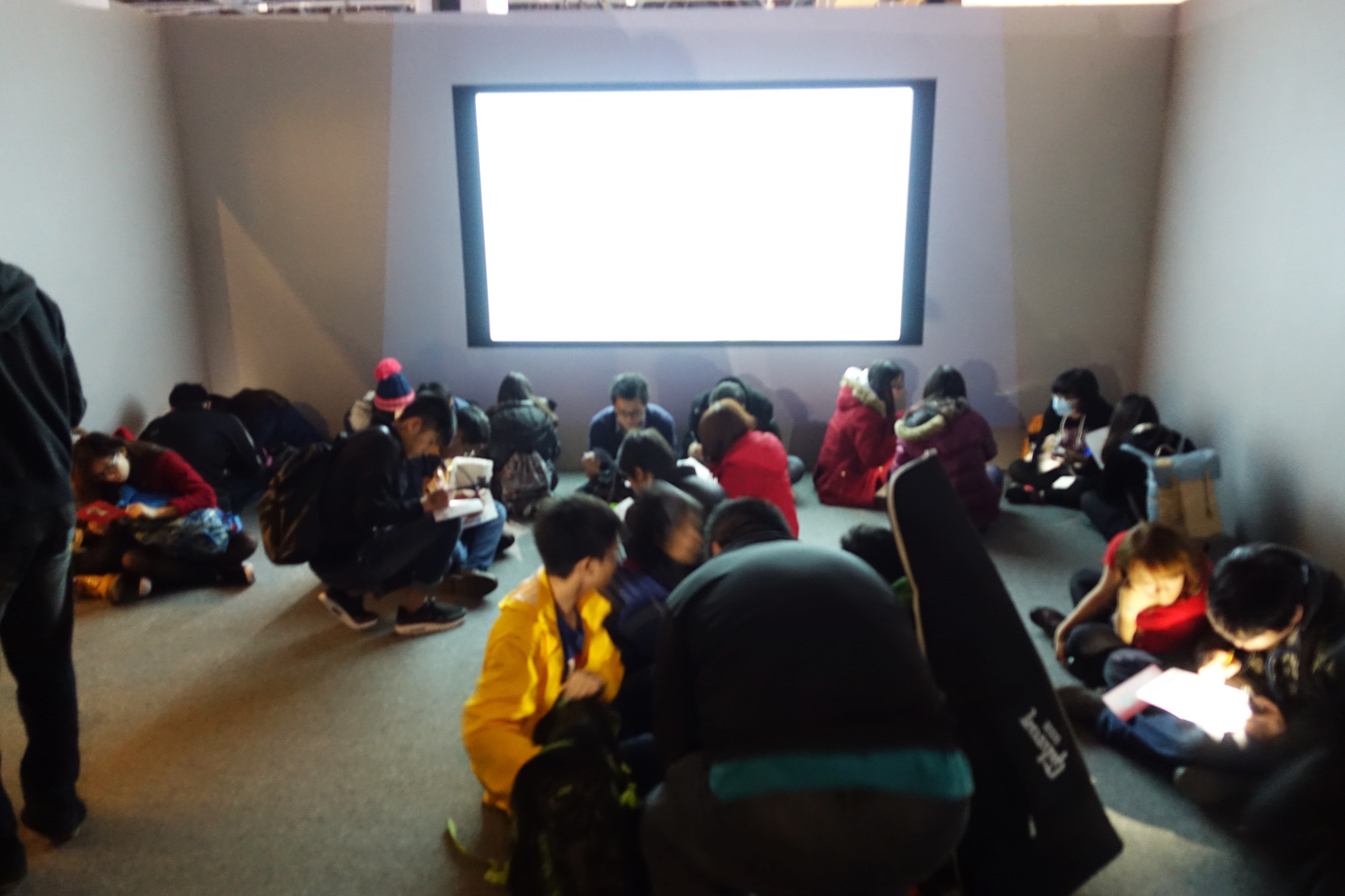 領完手冊後往內會看到電視牆,牆上撥放一些漫畫中的經典畫面,但大家都無心欣賞,開始坐或站著熱烈解謎....