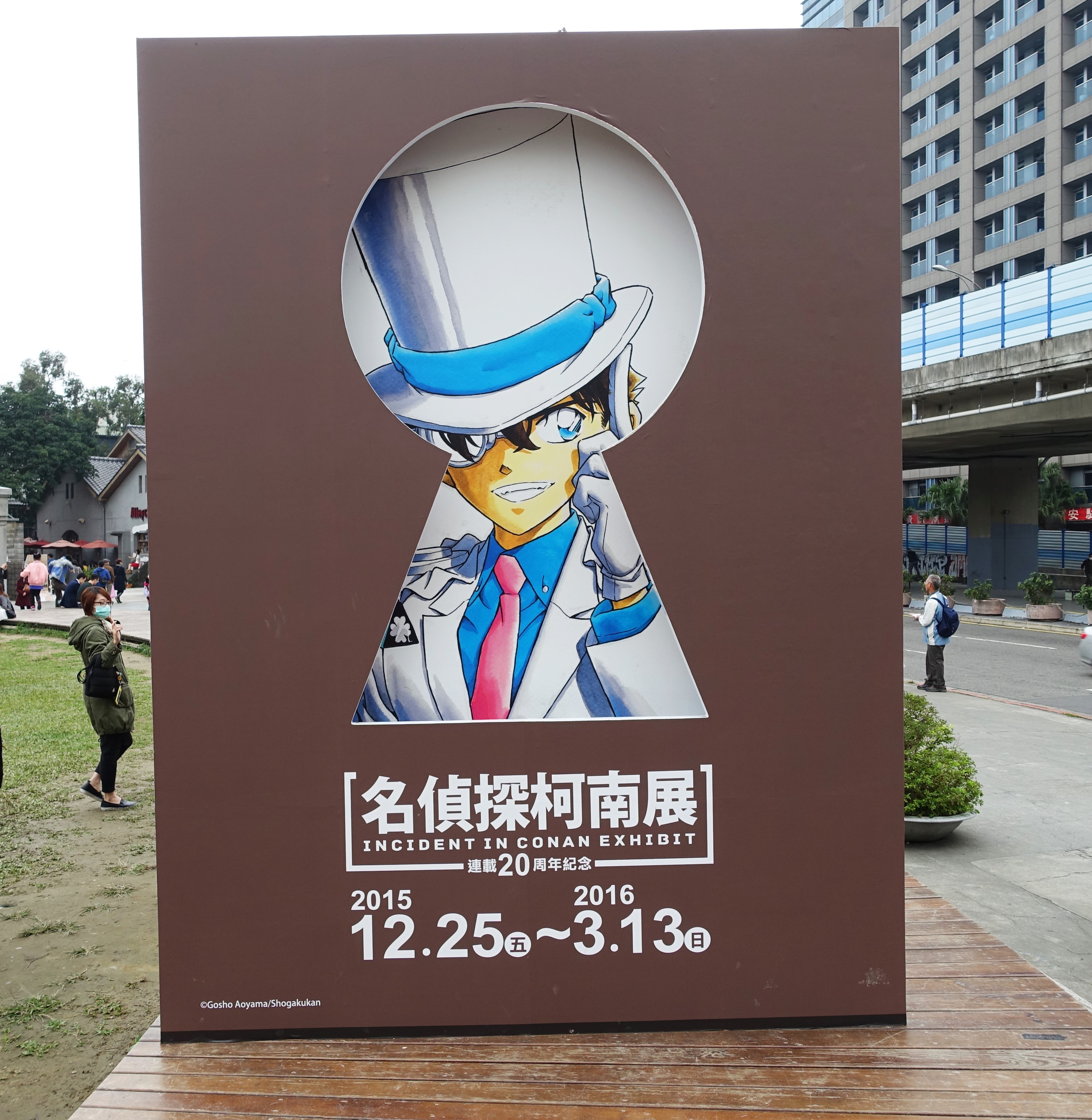 當天遠望華山文創園區的入口就可以看到柯南展的大看板,正面是柯南,左右兩側是新一與基德,看板前還有工作人員進行小小的解謎活動。