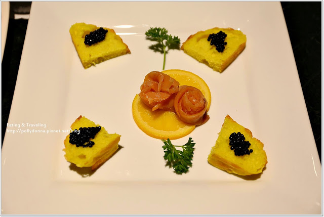 開胃菜是魚子醬佐麵包&醃燻鮭魚,魚子醬放在四塊小麵包上,這個麵包和剛剛吃到的手工麵包應該是相同的,搭配捲成像花的煙燻鮭魚,感覺好高級。
