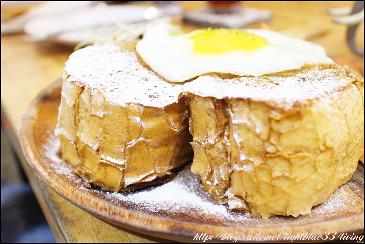 這是法式吐司盤,有三塊法式麵包、太陽蛋、沙拉、薯塊、德式香腸,而且為了怕金屬刀具會刮到木盤讓客人不小心吃到木屑,還提供了木製刀叉,雖然一開始有點考驗使用的順手度,不過我後來拿到訣竅就覺得也不會太困難