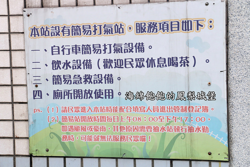 有自行車打氣設備、飲水機、簡易急救設備、廁所