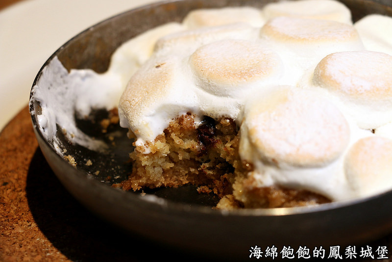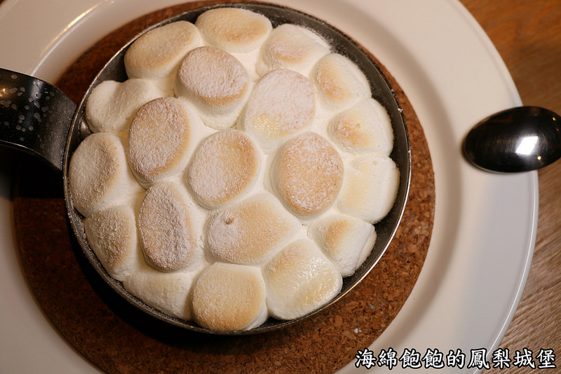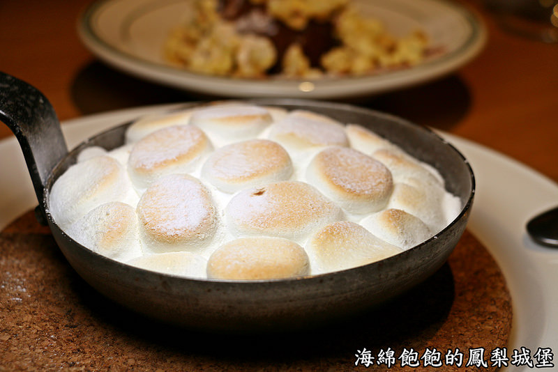 以小鐵鍋裝呈,裡頭塞滿滿的棉花糖