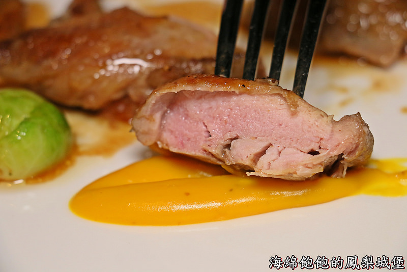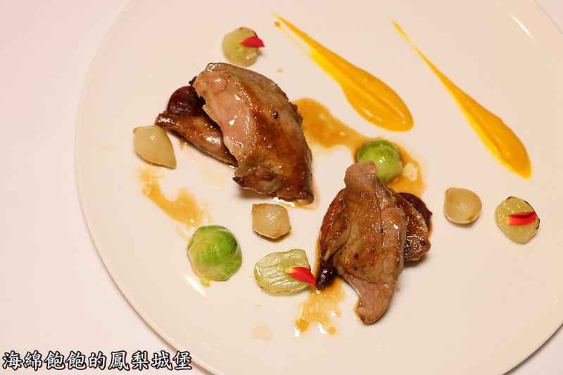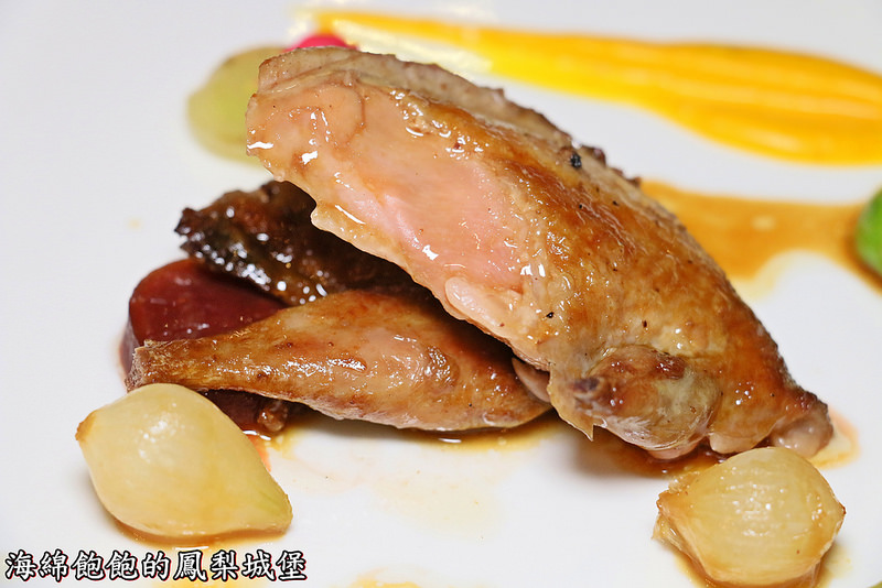 粉嫩的烤乳鴿沾著特調的南瓜醬汁,這畫面是不是很誘人阿!