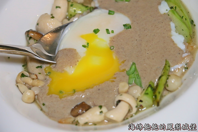 以蘆筍與菇類鋪底,搭配黑松露蘑菇醬