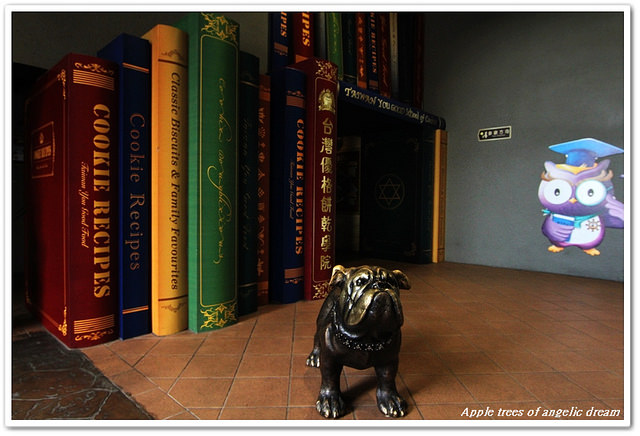 跟著觀光工廠的參觀動線~先來去餅乾殿堂,門口有鬥牛犬守候著一本本魔法書堆疊的入口
