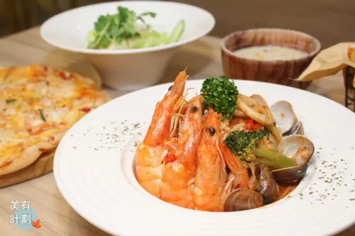 美有計劃 夾餡舒芙蕾鬆餅有特色,海鮮控必吃澎湃海鮮義大利麵