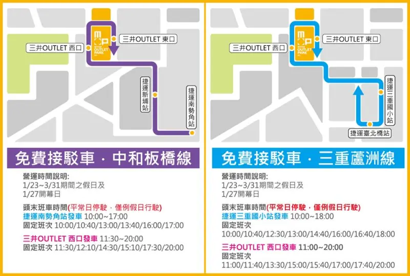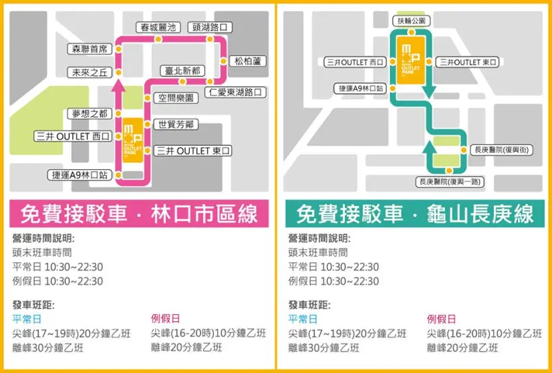 為舒緩大量車潮,林口三井四條免費接駁路線(龜山長庚線、中和板橋線、林口市區線、三重蘆洲線),並提供在地居民優先就業、停車、廣場免費使用及消費優惠。此外,桃園機場捷運線A9站即將開通,未來不僅可連結大台北的消費者,也成為國外觀光客來台的必經之站。為慶祝開幕,1/27起至2/14止的活動期間內,憑當日同一專櫃累積消費滿3000元(含)以上發票,即可兌換刮刮樂享券乙張,有機會抽中100元~5000元商品抵用券、各專櫃品牌好禮、以及日本東京四天三夜雙人自由行等大獎。