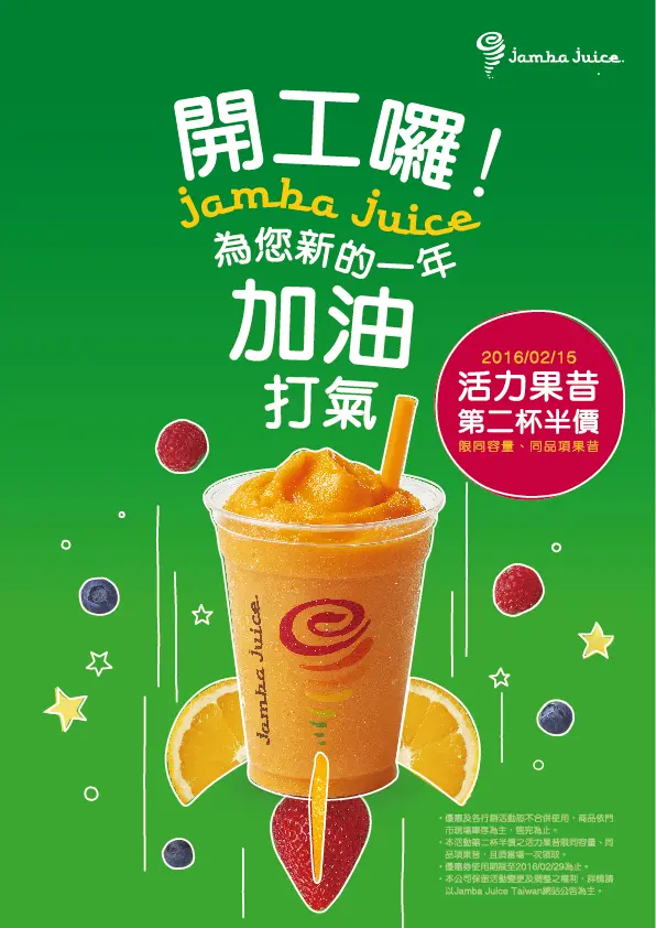 緊接在情人節後的開工日,Jamba Juice也要給消費者滿點的活力,為大家加油!在2/15開工當天推出活力果昔第二杯半價的元氣優惠,民眾只要在門市營業時間內,到Jamba Juice門市,凡點購活力果昔,就可享同容量、同品項果昔第二杯半價的優惠!