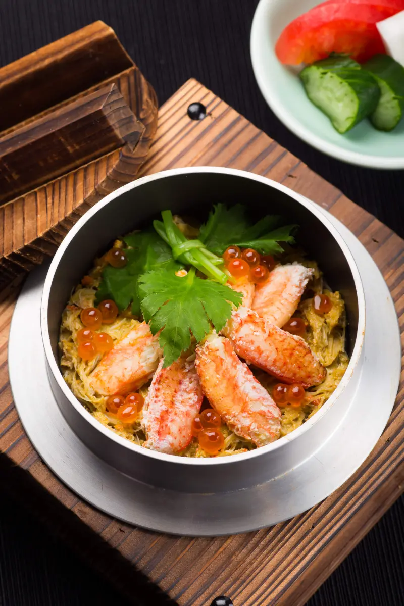 ▲「黃金毛蟹釜飯」料多餡美的釜飯與美味米飯的完美搭配可說是相輔相成,再舖上金針菇、蟹肉、蟹腳、蟹膏及鴨兒芹以中火慢煮數分鐘、開蓋後灑上黃金鮭魚卵,口感鮮彈、滋味濃郁分明。(圖/台北晶華酒店)