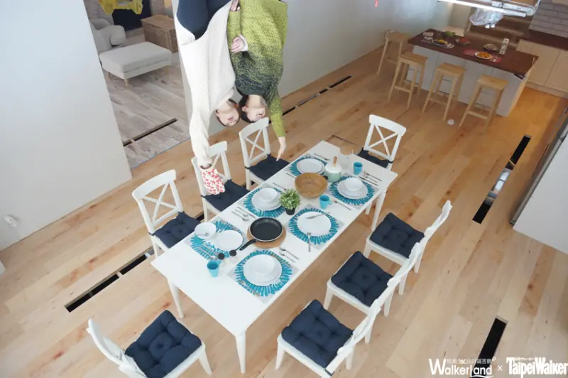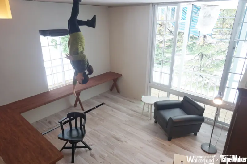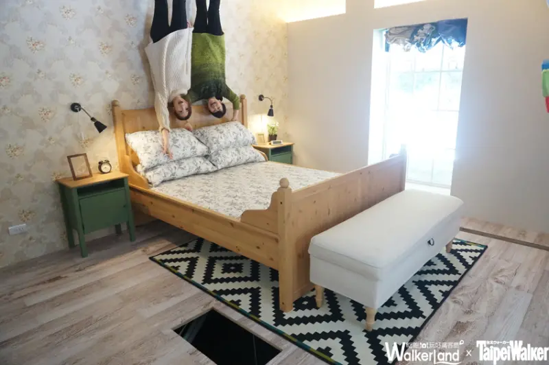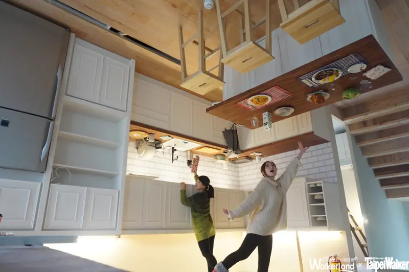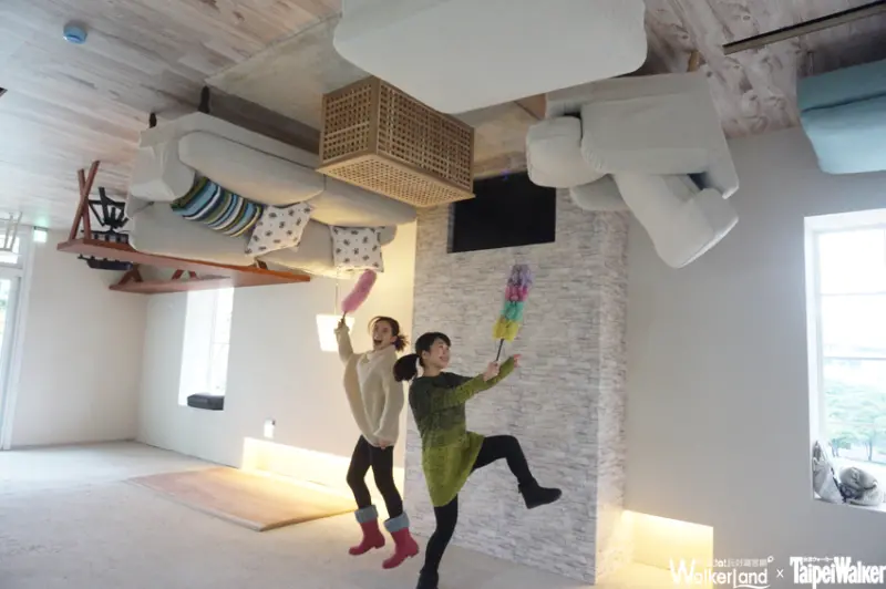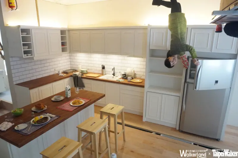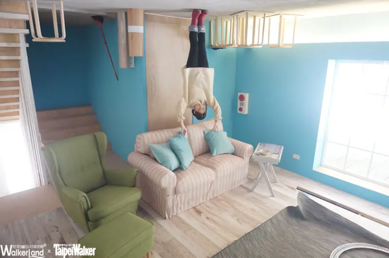 華山顛倒屋室內十二個奇幻居家空間裡看得到的都是實體傢俱、碗盤、餐具、盆栽全部都是顛倒佈置而成,居家空間環繞著蓋茲一家四口和忠實小狗Max。