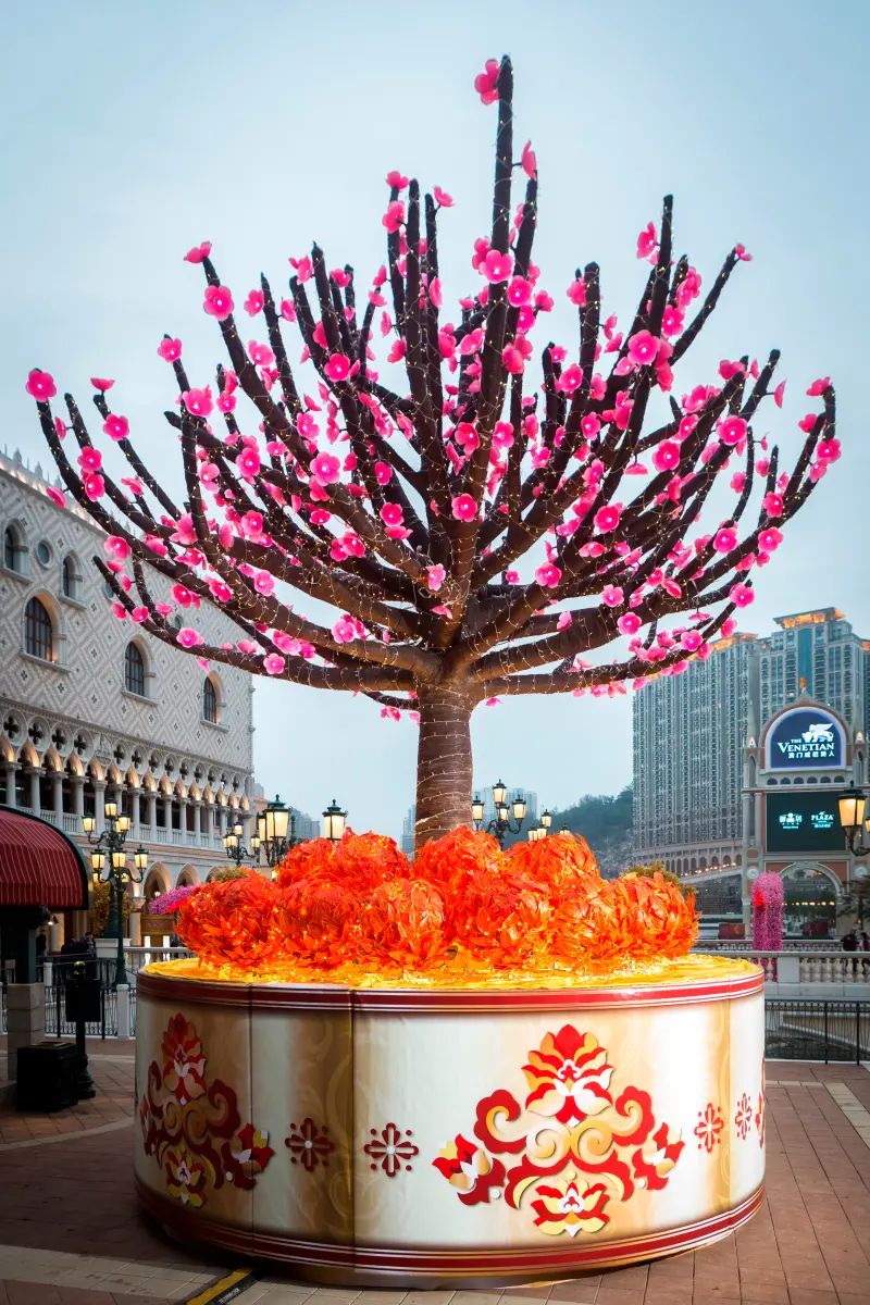 ▲三十呎大型桃花樹是澳門威尼斯人賀年慶典「福臨金沙」的其中一大亮點,展期直至2/22。(圖/澳門威尼斯人)