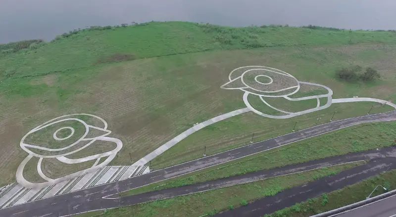 ▲鴨鴨地景藝術公園結合了水鳥生態主題及空間環境特色,以小水鴨為主題設置了兩隻水鴨圖形的步道,利用Google Earth的航照模式也能欣賞的到可愛的水鴨圖騰喔!(圖/新北市政府高灘地工程管理處)