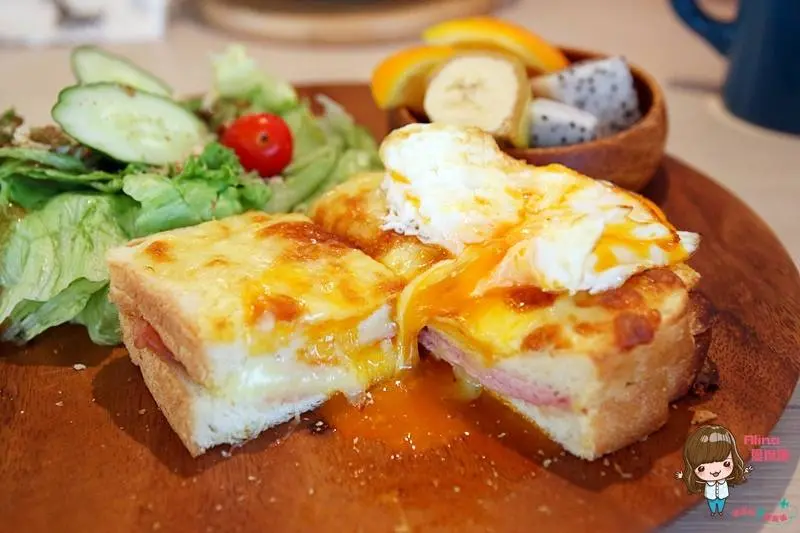 窩客『Alina 愛琳娜』推薦:上方焗烤乳酪絲加熱考到金黃帶點焦脆,戳破半熟蛋讓蛋黃緩緩流到吐司上,店家貼心的將吐司直接切成四塊,不用自己再用刀叉分割,我個人是豪邁的直接用手拿,比較方便食用,將一塊輕輕拿起,看著焗烤與內餡起司分離時的依依不捨,真的蠻喜歡馬茲瑞拉起司的香度及Q度,搭配焗烤的方式食用,起司鹹香度更出色《看全文》