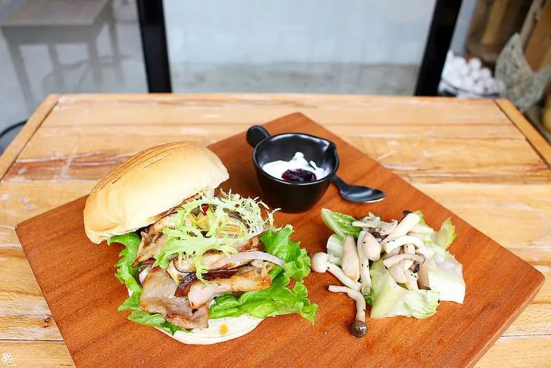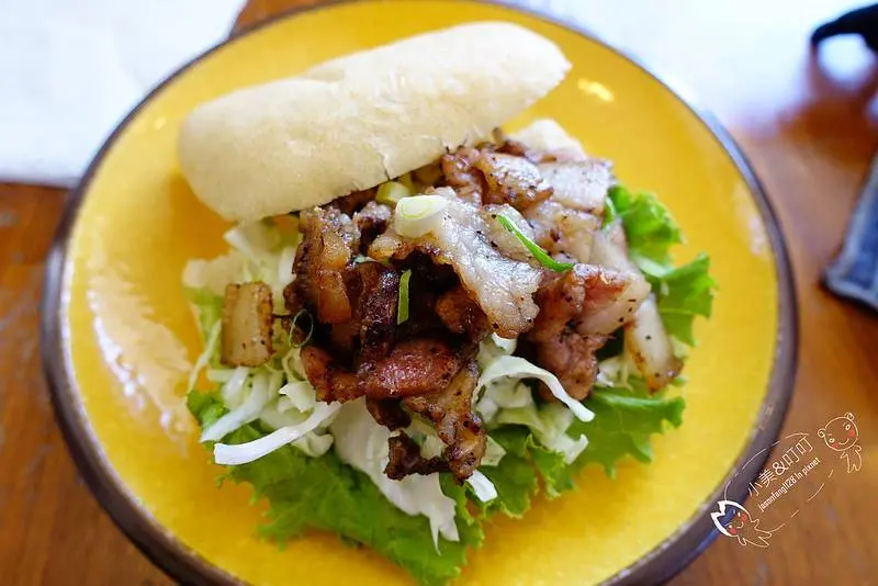 Percent CAFE %的門把非常特別,是放大尺寸的湯匙和木叉,從小小地方便能瞧出Percent CAFE %的用心和巧思,我很喜歡像這種和別人不一樣的設計。Percent CAFE %的萊姆味噌松阪堡,主要內餡有香菇切片、紫洋蔥絲、生菜和多塊松阪豬肉,淋有味噌醬汁,並灑上些許的萊姆薄皮增添香氣。Percent CAFE %的松阪豬肉介於Q、硬之間,未達我喜愛的彈牙口感,但是店家給得很大方,份量令人滿意。![]()