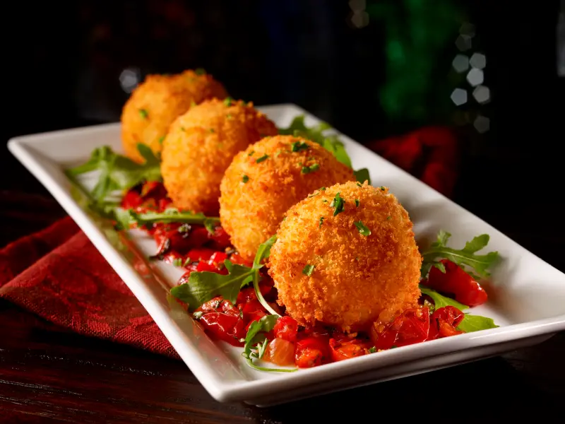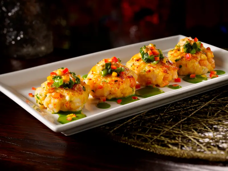 ▲「南洋鮮蝦餅」的內餡由豐富飽滿的鮮蝦加上綜合海鮮手工鮮製成,配上泰式是拉差(Srirach)奶油醬及泰式綠咖哩醬,是道充滿異國風味的開胃料理。(圖/TGI FRIDAYS)