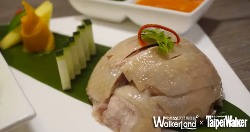 膠質豐厚的老母雞切片堆疊成圓拱,搭配海南醬及蔥油醬,和新鮮的生菜包覆一起食用,清爽中帶點微辣。