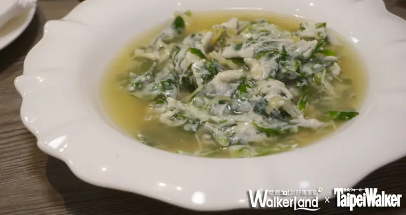 新鮮皇宮菜裹上滑口雞蓉,倒入「瑤柱上湯」拌炒,讓皇宮菜更具口感彈性,讓人捨不得放下筷子。