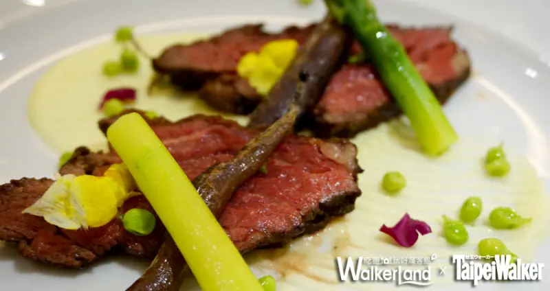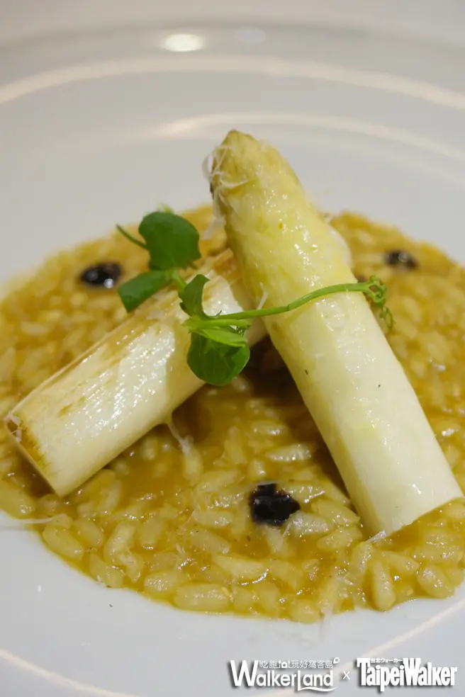 季節限定的「白蘆筍饗宴」一共有四道主菜,白蘆筍燉飯選用義大利米燉煮,不軟爛的米心,保留了米的口感,微微的紅酒香拌著帕瑪森起司,香氣濃郁,盤中的白蘆筍先燙後煎,不僅鎖住水份,微微的焦香更顯迷人;美國頂級老饕牛排,主廚善用食材最美本質,牛排先微炸後燒烤,牛肉依然保有鮮嫩口感,採用「綠蘆筍」作為配角彰顯牛肉的美味。