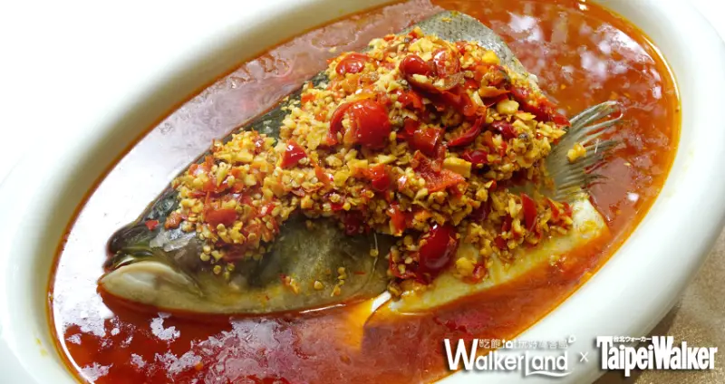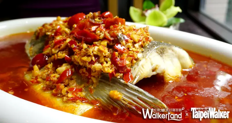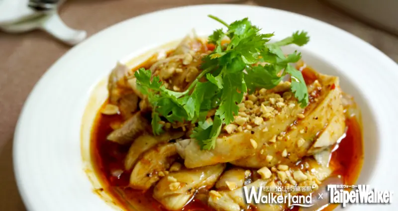 魚料理不只著重在魚頭本身,更要品味的是特製剁椒醬,主廚特選四川特有的泡燈籠椒,再添上花椒油和紅油,獨特的辣椒香氣,辣中帶麻,將剁椒湯汁拌入北投新鮮的油光麵,鮮辣微麻的舒暢口感,讓人一吃就會上癮。另一道料理「口水雞」,麻中帶辣,肉質彈嫩好入口,更是不容錯過的經典佳餚。