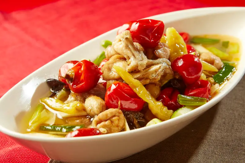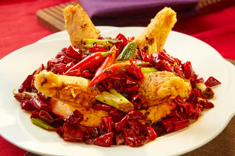 ▲ 蜀香辣子雞。 重慶當地的老菜代表,豪邁大器的擺盤風格,光是辣椒就佔了整盤份量的一半以上,當地人稱『在辣椒裡找雞吃』。這道菜講究香辣麻口,彭師傅選用雞中翅部位,以胡椒、料酒、蛋清和鹽醃漬,接著入鍋油炸至酥散香脆,搭配煲燒入味的金錢菇,辛香味豐。