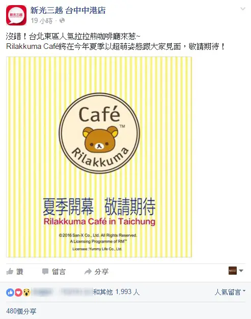 被媒體列為《十大最難訂位餐廳》的「Rilakkuma Café 拉拉熊咖啡廳」要來台中了!去年,全球第一家拉拉熊專賣咖啡店落腳台北東區,萌樣十足的拉拉熊裝潢、餐點,吸引不少大小朋友朝聖,掀起一股訂位熱潮,現在新光三越官方粉絲團也宣布,Rilakkuma Café將在今年夏天進駐台中中港店!![]()