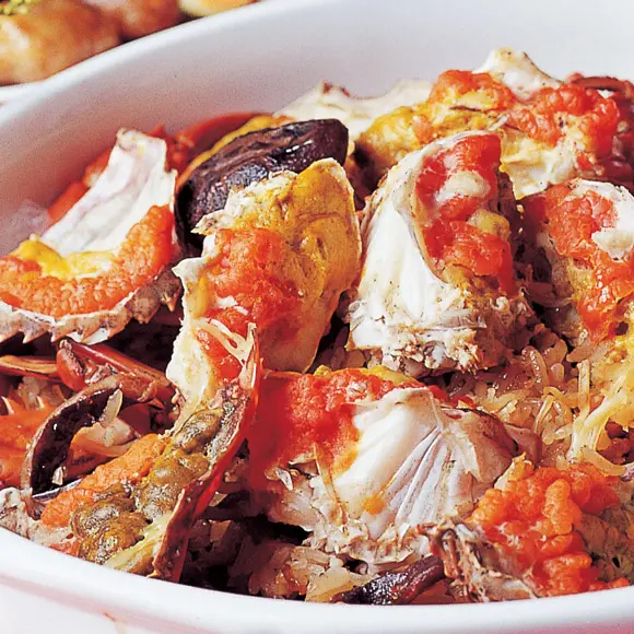 紅蟳米糕/比常民小吃使用更澎湃的好料,變身筵席大菜。聞名遐邇的台南紅蟳米糕和北部的筒仔米糕不同,糯米搭配新鮮紅蟳、干貝、香菇、絞肉、蝦米、土豆等配料蒸煮而成,堪稱必點招牌。大份適合7、8人、小份3、4人食用。