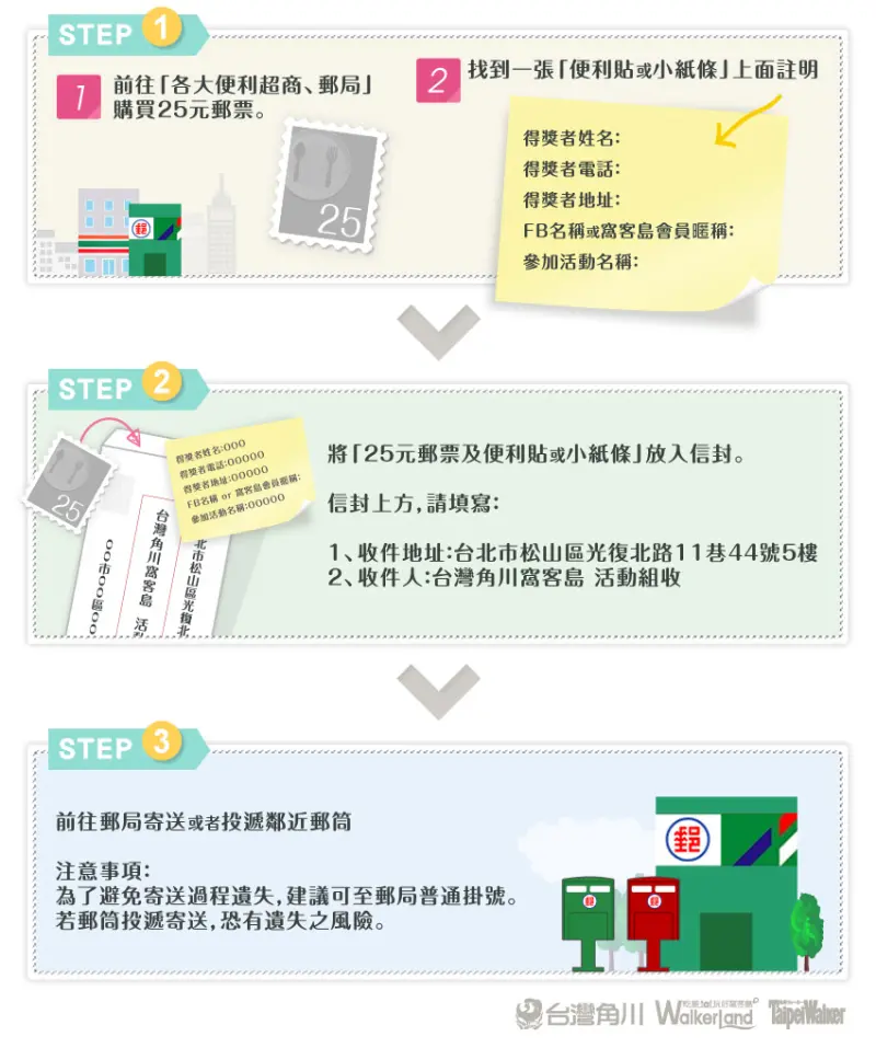 (3) 領取方式(二):請郵寄25元郵票至台北市光復北路11巷44號5樓(台灣角川窩客島 收)