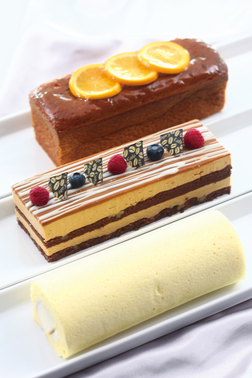 點心主廚三週年推薦長條蛋糕三款,歡慶價8折,巧克力海綿蛋糕夾入白蘭地焦糖慕斯的焦糖巧克力核桃慕斯,香氣口感讓人稱讚,歡慶價NT$240元(原價$300);香橙奶油蛋糕以經典柑曼怡(Grand Marnier)法國干邑橙香酒及柳橙絲烘焙成濃郁的重奶油蛋糕,歡慶價NT$240元(原價$300);芋香奶凍捲結合瑞士捲及戚風蛋糕的概念製作,精選甲仙芋頭製作的芋泥與義式奶酪,口感細緻鬆軟,是大小朋友的最愛,每個NT$200元(原價$250)。