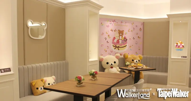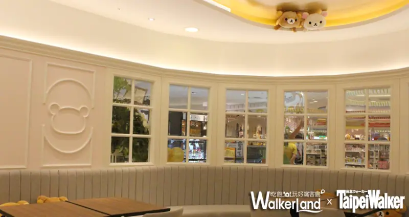 有別於台北店時尚簡約的裝潢風格,台中店特別以 《Rilakkuma Sweets》系列為設計靈感,展現出明亮整潔的用餐空間,巧妙融入輕法式古典風格,甜蜜浪漫氛圍瀰漫整個餐廳,滿足粉絲們的少女心。仔細往天花板瞧瞧,拉拉熊和小白熊玩偶正探頭向大家說Hello!![]()