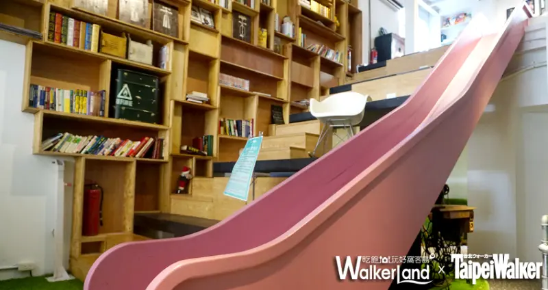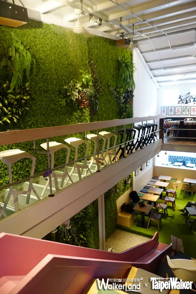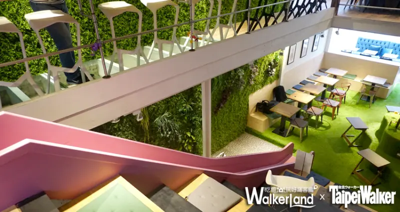 走進三樓空間,約一層樓高的粉紅色溜滑梯映入眼簾,木質台階、大片綠地,現場宛如一間小型遊樂場,對於童心未泯的大人們更是一個療癒空間。還有四樓的迷你版天空步道,就連店主人看了都會心驚驚,即便如此,能將咖啡店揉合出不同氛圍,提供無壓力的環境更為重要。