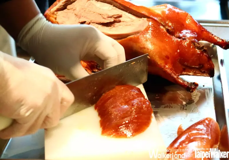 片一隻鴨僅需6-8分鐘時間,過程中不得傷及骨頭,但也要以刀工片出花樣,將烤鴨片至呈柳葉條狀,5公分長、0.2公分厚,鴨皮與鴨肉完美搭配,完美營造出肥而不膩的口感,就是美味的獨特和關鍵所在。![]()