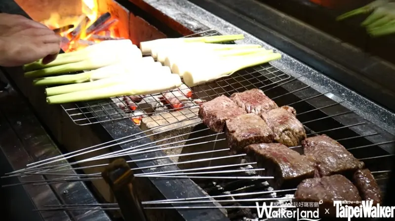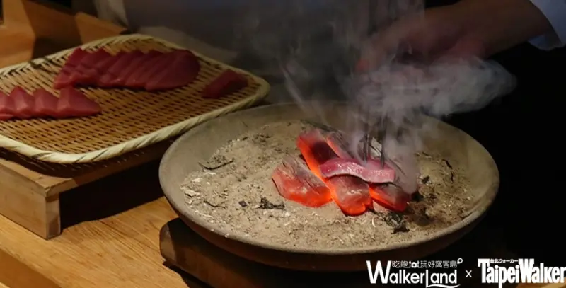 ▲日本黑鮪魚大腹置於燒到通紅的備長炭上,取代一般火槍炙燒的烤法,利用火炭的高溫快速燒烤,搭配煙燻鹽一口吃下,黑鮪魚味道鹹鮮、油潤豐口。