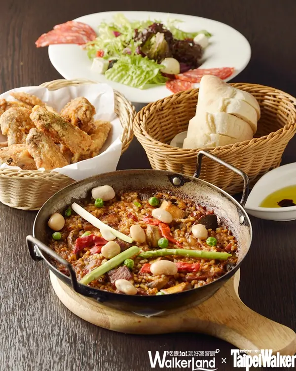 瓦倫西亞烤飯430元(前)/二人份、西班牙風味炸雞翅280元(左)/八支、西班牙市集蔬菜沙拉220元(後)/瓦倫西亞烤飯放入特製醬汁和醃製預煎的雞肉、豬肉、與西班牙Bomba米一同燉煮,口感軟中帶硬,滋味,令人難忘!西班牙風味炸雞翅是店內必點的超人氣點心。以新鮮生菜搭配西班牙醃製品的西班牙市集蔬菜沙拉,風味獨特。