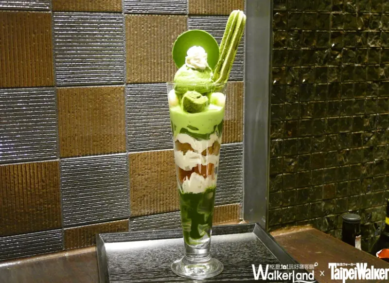 ▲「108 Matcha Bar特級聖代」內含焦香黃豆粉蕨餅、抹茶果凍、白玉、抹茶霜淇淋、抹茶薄餅、抹茶長條棒、鮮奶油等十幾種口感各異的食材,推疊出超過30公分高度的聖代,為旗艦版抹茶甜點!