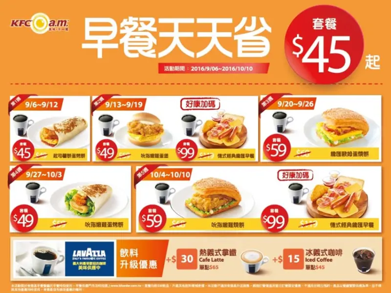 肯德基「早餐天天省」嚴選不同風味餐點,以鮮嫩滑順的鮮雞蛋搭配多樣化主食,讓消費者周周有驚喜期待!9/13~9/19「早餐天天省」率先打出明星經典「吮指嫩雞蛋堡套餐」,以原塊雞腿肉與11種神祕香料醃漬入味,再以肯德基獨門7-10-7(抖/翻/壓)裹粉手法新鮮現炸,酥脆多汁的吮指嫩雞與Q彈嫩蛋一口咬下,厚實與滿足一次到位!現在搭配小杯LAVAZZA義式熱咖啡,只要優惠價$49!而今年夏天以早午餐風格新推出的「德式經典總匯早餐」,精選德國國民美食「法蘭克福燻腸」與香氣濃郁「櫸木煙燻培根」,搭配鬆軟厚切吐司、香滑嫩蛋與起司片,超值澎湃組合加$30飲品,限時優惠只要$99!9/20~10/10期間另有「總匯歐姆蛋燒餅套餐」、「吮指蛋烤餅套餐」豐富優惠組合,讓消費者在中秋假期結束後,也可以用高CP值的價格,享用安全食材與衛生的美味早餐。