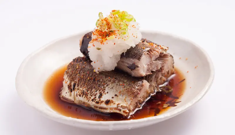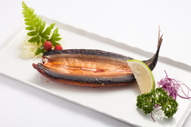 ▲本次試食會展出的「烤一夜干」。魚材是將嚴選的花鯽魚塗上日本產的海鹽、再風乾製成。實際料理時再將一夜干烤熟,並以噴槍炙燒表面。