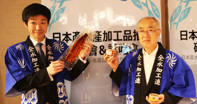 ▲水產加工食品輸出促進委員會 關跟先生(左)、日本水產罐頭輸出水產業工會 長島先生(右)聯袂出席本次日本產水產加工 推廣研討會及試吃會,宣廣日本水產品之優勢與品質保證。