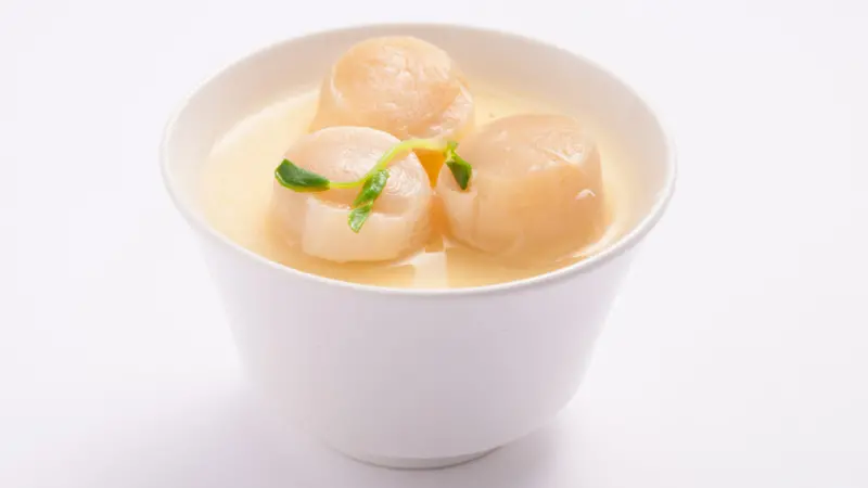 ▲干貝蒸蛋是常見的日式料理,由蛋和日本產柴魚昆布調成蛋液用蒸籠蒸熟,再放上干貝調理而成。