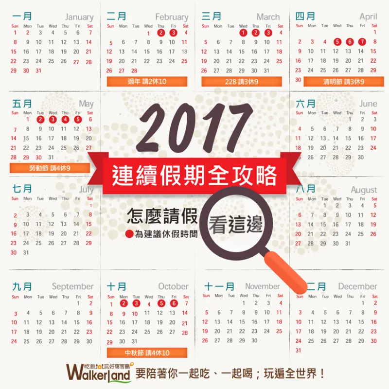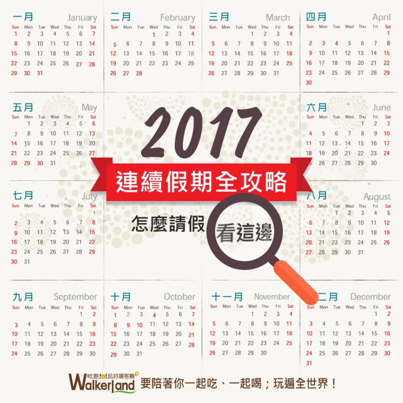 WalkerLand窩客島數位編輯整理出「106年(2017)連續假期請假全攻略」。就是要陪你吃、陪你玩,不想回來上班了!