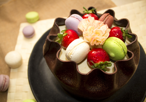 蛋糕上綴以新鮮草莓與有「少女酥胸」之稱、充滿貴族氣息的馬卡龍,甜點時尚度百分百!四種口味的馬卡龍:檸檬、巧克力、香草與覆盆子,外層薄如蛋殻的酥脆口感,加上甜蜜蜜、軟綿綿的內餡,一入口盡是香甜與芬芳,絕對可以擄獲媽咪的芳心!