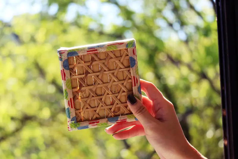 將天燈回收的竹材,透過王生輝老師以及平溪在地耆老們的巧手教學下,再點綴上平溪傳統花織布,華麗變身成為獨一無二的創意杯墊。