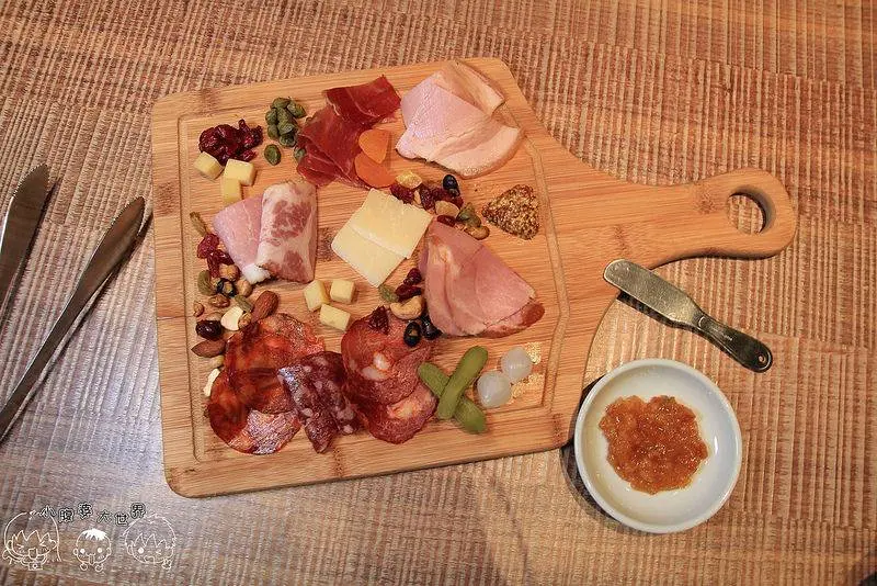 歐式肉品起司拼盤,附酸黃瓜/小洋蔥/堅果/果乾/起司/法國純天然水果果醬/法國芥末子醬。建議享用方法,先從顏色淺的開始享用(味道比較淡→重),先品嘗原味後再搭配堅果或起司來品嘗。<詳全文及店家資訊>