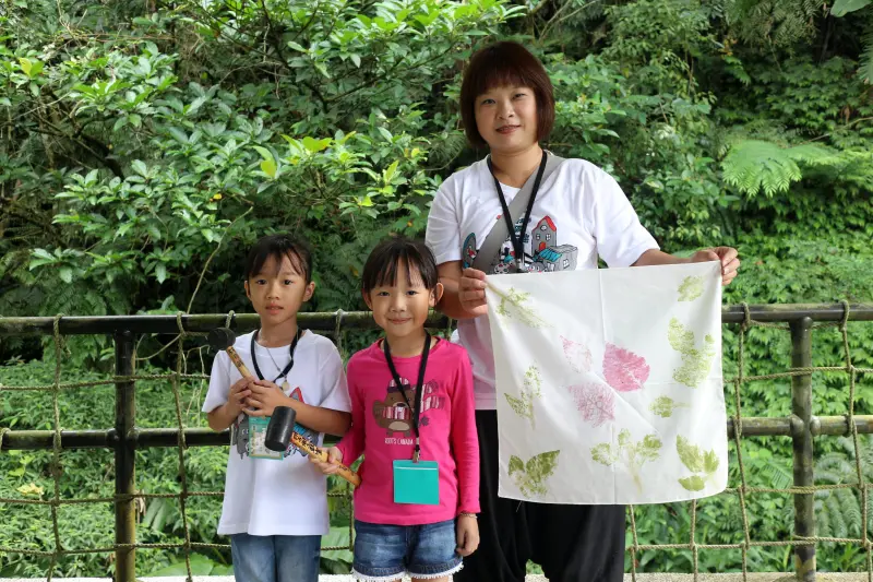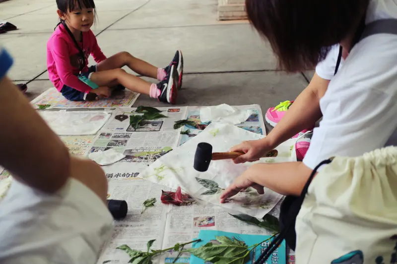 取自石碇千島湖山區周邊在地植物,以及在地產的蜜紅紅茶染布,這是胖子鄉土教室自舊時鄉村生活的回憶中,創新發想的手作體驗!將葉草擺放置於將要槌染的白布上,蓋上塑膠帶,手持槌子敲敲打打並點綴上自我色彩,就成了一幅獨一無二的藝術作品,將作品繫成各種裝飾處,立即展現文青style!