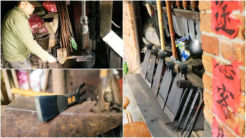 在早年農業時代,對於鋤頭、鐮刀等種田用具需求量高,因此手工打鐵舖就此而生,即便目前農業用具需求量並不如當年,但家用之菜刀、剪刀等鐵具,也可於打鐵舖老師傅的傳統工藝下,敲打、磨製出一把把手作工具。而店裡也尚保存著古老打鐵爐灶,在充滿灰黑色系的小空間中,最能見證歷史產業的變遷…