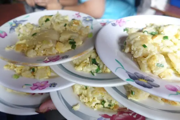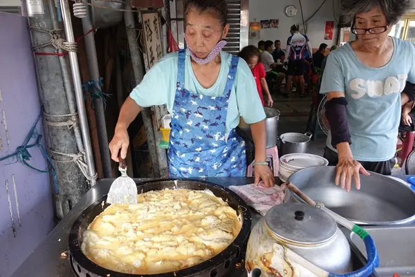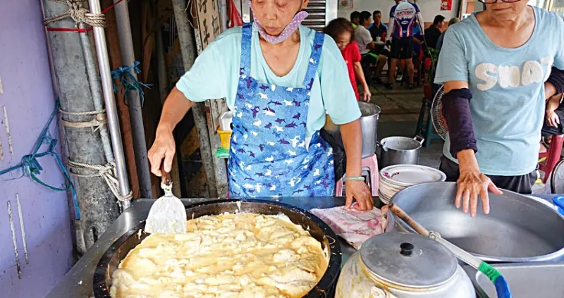 「胖樺」說:不是一張蛋餅皮一張蛋餅皮的去煎,「阿姨蛋餅」的烹調方式,是先將一大鍋的麵糊下鍋,下頭的的麵糊熟透後去做翻炒動作,接著倒入大量蛋汁繼續翻炒。<詳全文>![]()