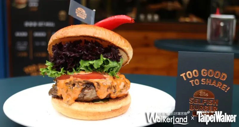 ▲拉亞漢堡新品牌「Selfish Burger」,招牌煙燻牛肉漢堡肉汁飽滿。(圖/張子豪 攝)