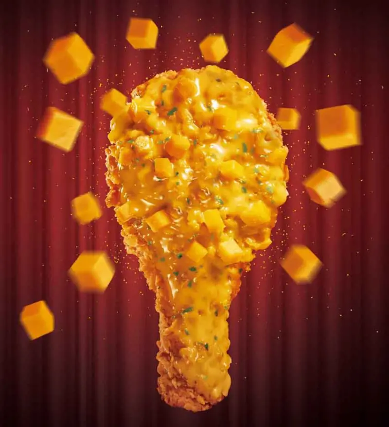 肯德基繼去年推出黃金開運起司雞大獲好評後,今年將其升級再進化,以立體起司丁結合炸雞的全新手法再度引領速食新風潮。此次大手筆運用起司醬、起司粉與起司丁,將三種不同起司的美味口感與層次完全展現,首先將新鮮雞肉以11種神秘香料醃漬入味後,再以7-10-7(抖/翻/壓)裹粉手法酥炸至金黃香脆,接著淋上香濃切達風味起司醬將咔啦脆雞層層包裹,再撒上切達起司粉與鮮綠的洋香菜提味,最後鋪上一塊塊金黃切達起司丁,如同閃耀的金塊堆疊在起司雞上,象徵著滿滿好運。三種不同口感的起司與鮮嫩多汁的咔啦脆雞交織出的豐富口感,一口咬下穿著華麗外衣的「金宴起司雞」,起司丁在口中緩緩融化的濃郁味蕾體驗,搭上酥脆的口感層次,享受令人吮指回味的金色饗宴。![]()